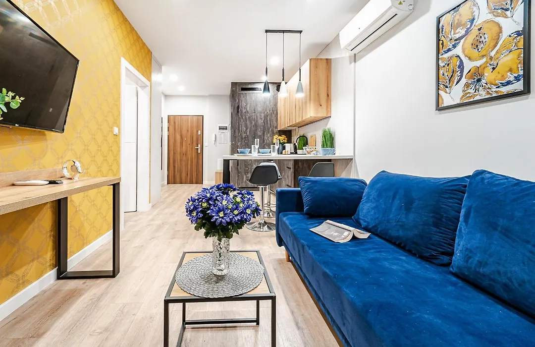 Mokotow 1 Apartment includes a patio, a balcony, and a sitting area with air conditioning for utmost comfort. This apartment offers guests the convenient feature of hairdryers and towels in the bathroom. Additionally, you'll find a bidet and a walk-in shower.